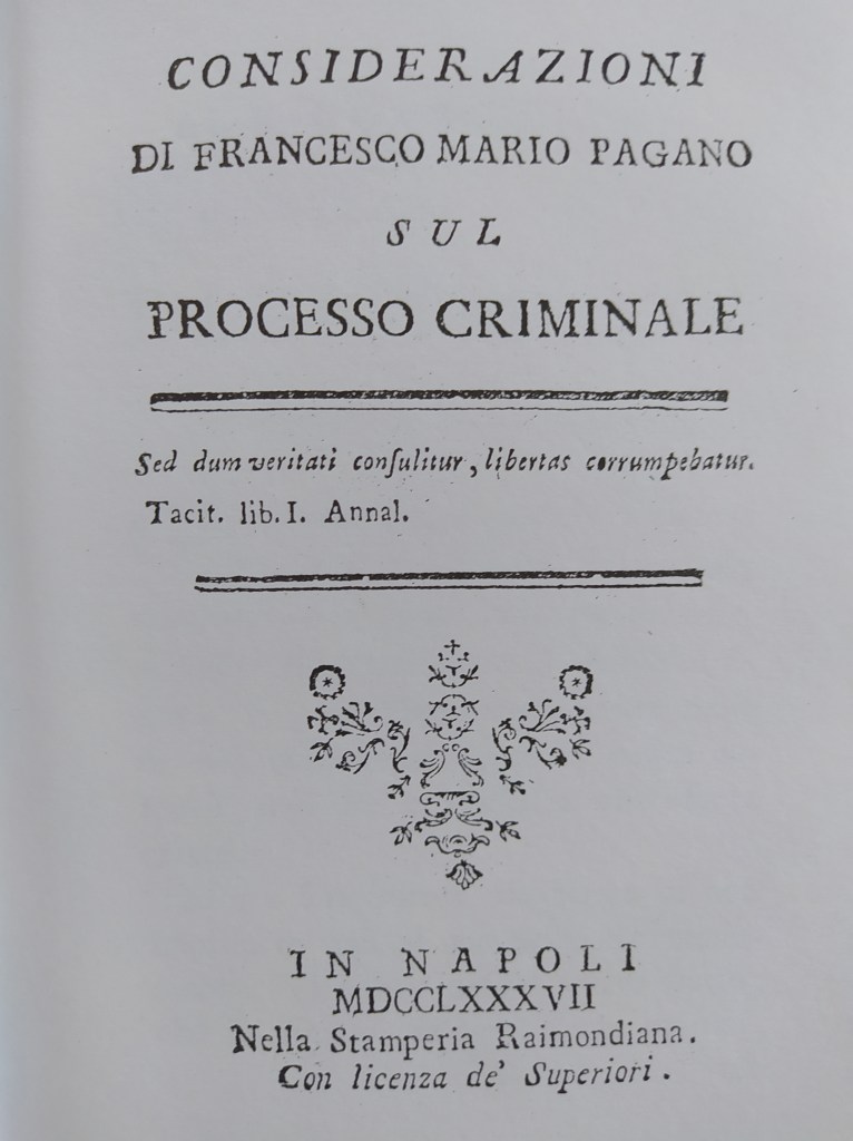 “Il criminale processo stabilendo la formula dei pubblici giudizi è la custodia delle libertà, la trincea contro la prepotenza, l’indice certo della felicità nazionale“. (Francesco Mario Pagano, Considerazioni sul Processo Criminale, Napoli 1787).
