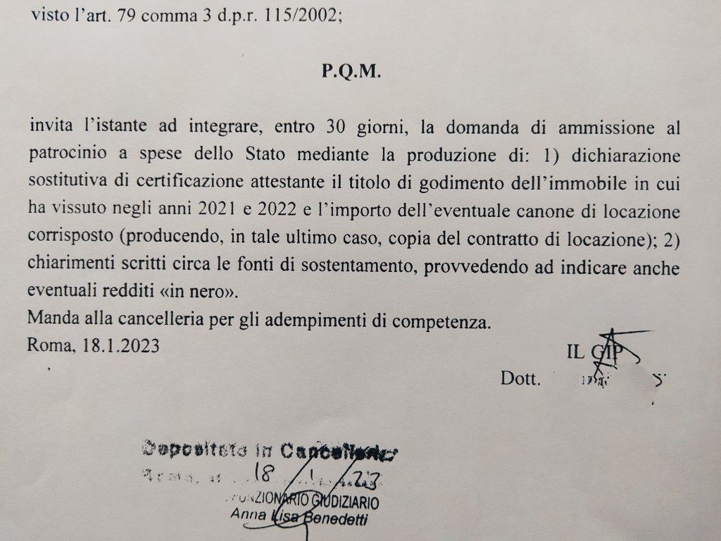 Nell’ordinanza del Gip di Roma del 18 gennaio si chiede all’interessato, che aveva depositato la richiesta di ammissione corredandola con l’ultima dichiarazione dei redditi, di depositare una “dichiarazione sostitutiva di certificazione attestante … anche eventuali redditi in nero”.