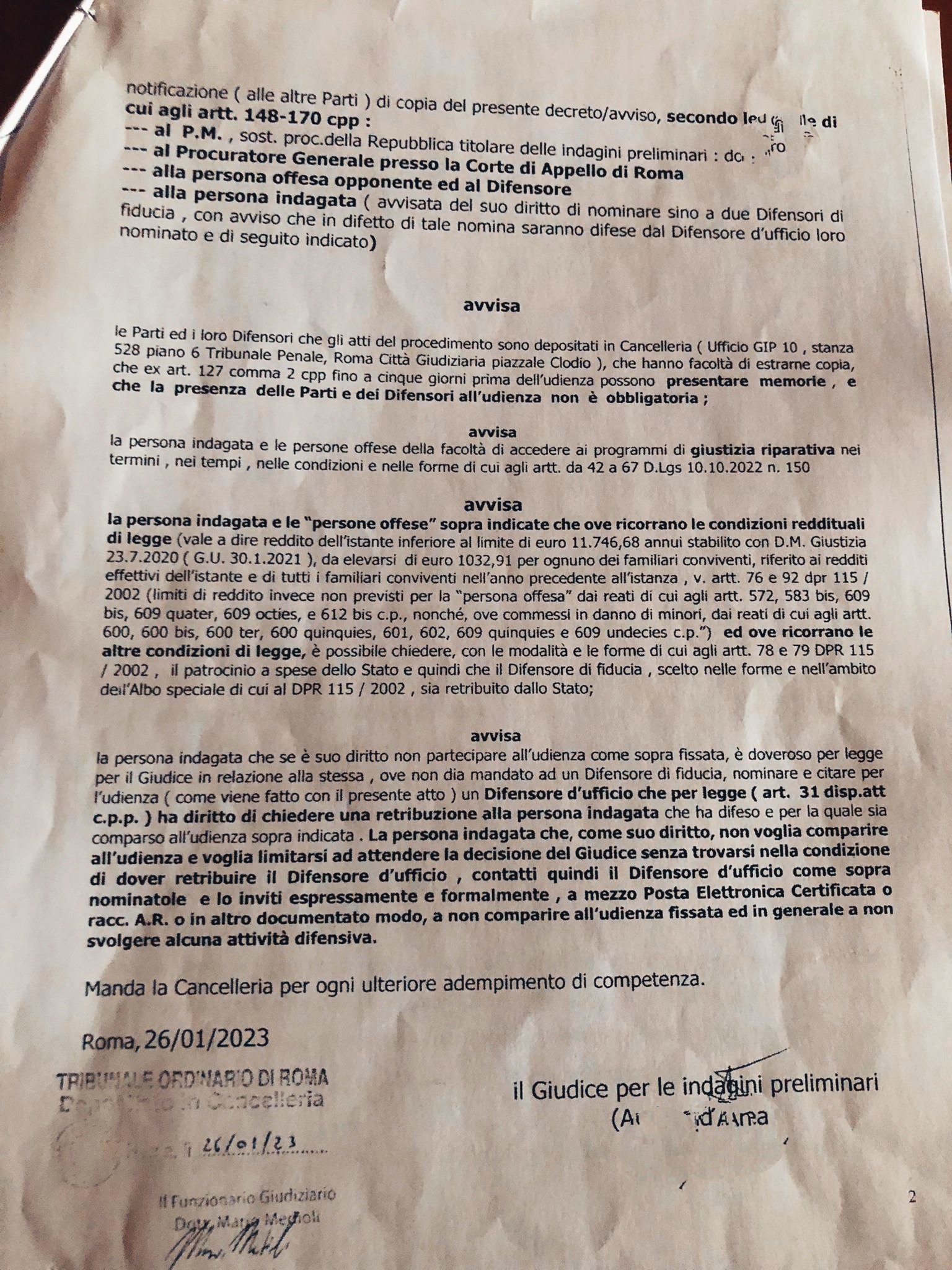 Al tribunale di Roma c’è un Gip che tra gli avvisi riportati nell’avviso di fissazione dell’udienza ha pensato bene di inserire anche questa frase: “avvisa la persona indagata che è suo diritto non partecipare all’udienza come sopra fissata, è doveroso per legge per il giudice in relazione alla stessa, ove non dia mandato ad un Difensore di fiducia, nominare e citare per l’udienza (come viene fatto con il presente atto) un Difensore d’ufficio che per legge (art. 31 disp. Att. c.p.p.) ha diritto di chiedere una retribuzione alla persona indagata che ha difeso e per la quale sia comparso all’udienza sopra indicata.