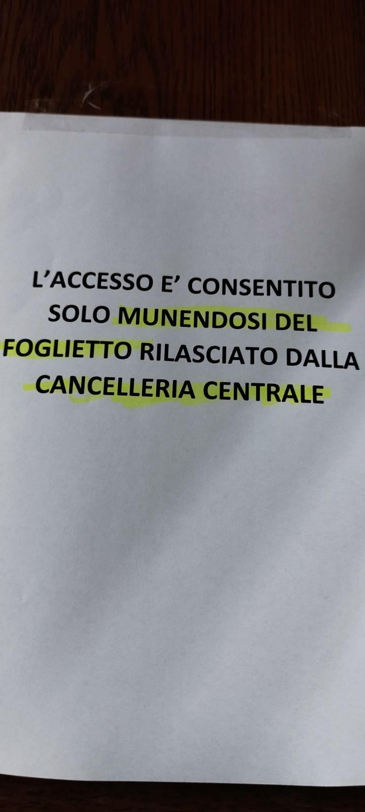 L’estensore con piglio decisionistico, che non ammette repliche, ha stabilito ed ordinato agli avvocati che vogliono accedere agli uffici posti al primo piano: “L’accesso è consentito solo munendosi del foglietto rilasciato dalla cancelleria centrale”.