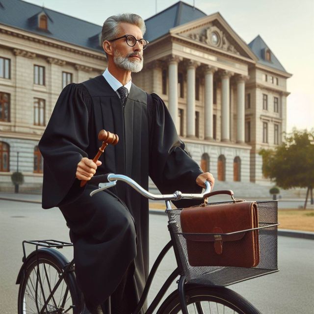 Un magistrato entra in Tribunale a bordo di una bicicletta, ne percorre i corridoi fino ad arrivare nell’aula dove dovrà tenere un’udienza per direttissima.