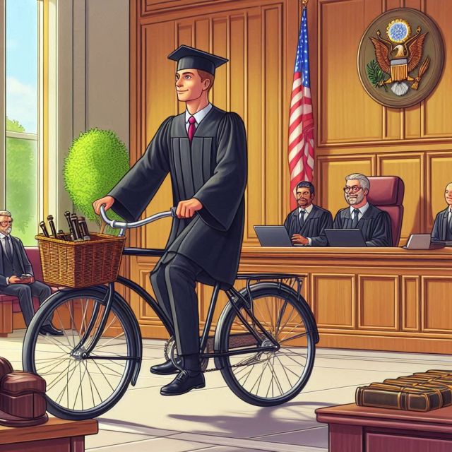 Un magistrato entra in Tribunale a bordo di una bicicletta, ne percorre i corridoi fino ad arrivare nell’aula dove dovrà tenere un’udienza per direttissima.