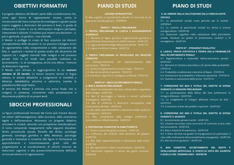 Il Dipartimento di scienze giuridiche e sociali dell’Università G. d’Annunzio di Chieti-Pescara ci segnala, e diffondiamo volentieri la notizia, di avere organizzato per l’anno accademico 2025-2026 un master di II livello su Accertamento penale e bias del ragionamento, coordinato dalla Professoressa Cristirana Valentini, ordinaria di diritto processuale penale.